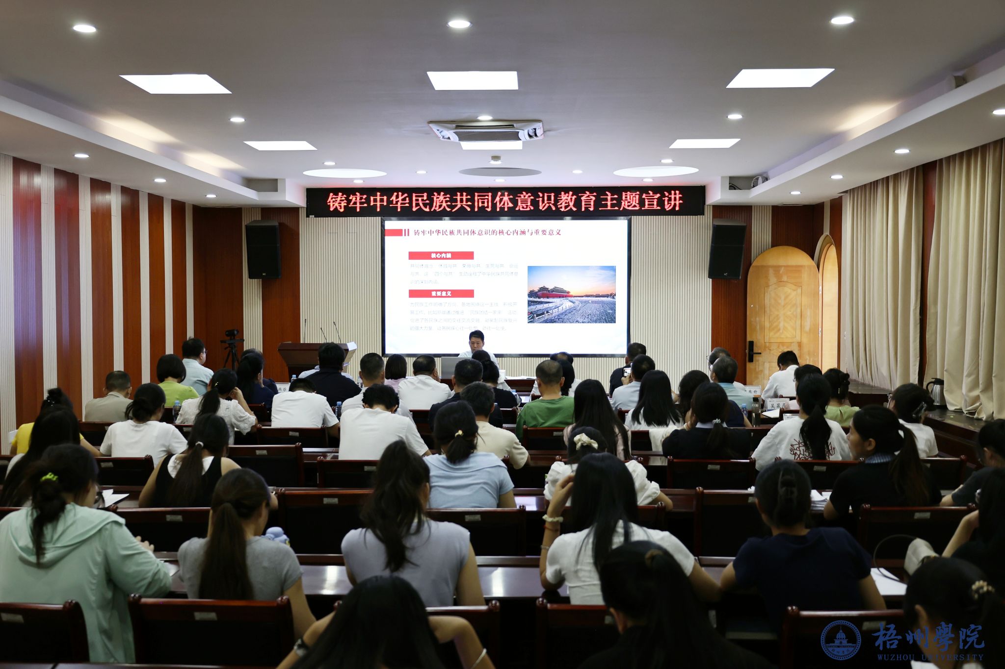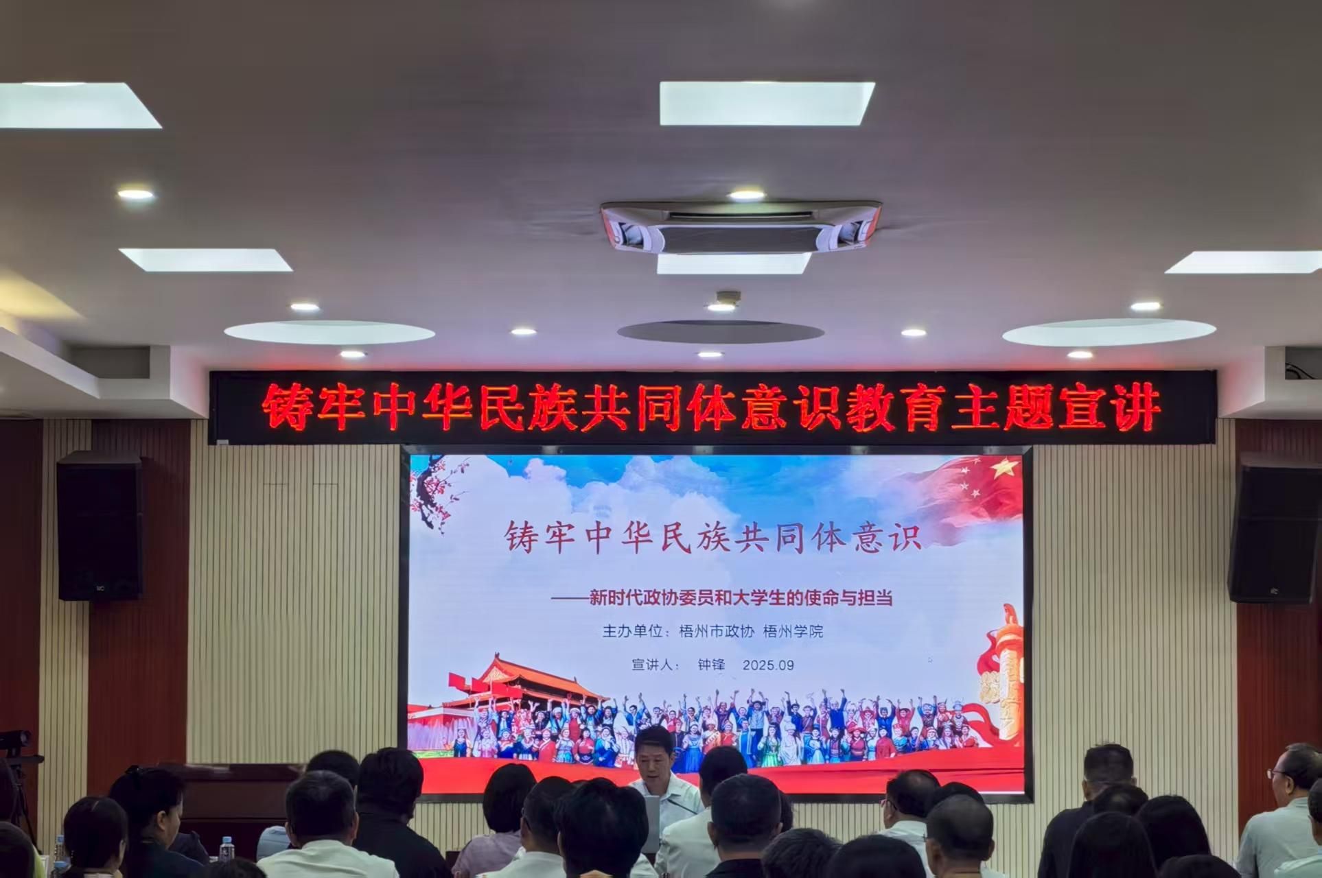 9月17日下午,梧州市政协副主席钟锋到我校开展“铸牢中华民族共同体意识——新时代政协委员和大学生的使命与担当”的主题宣讲。宣讲会由党委统战部副部长何志伟主持,市政协代表和马克思主义学院师生代表近100人到场聆听。