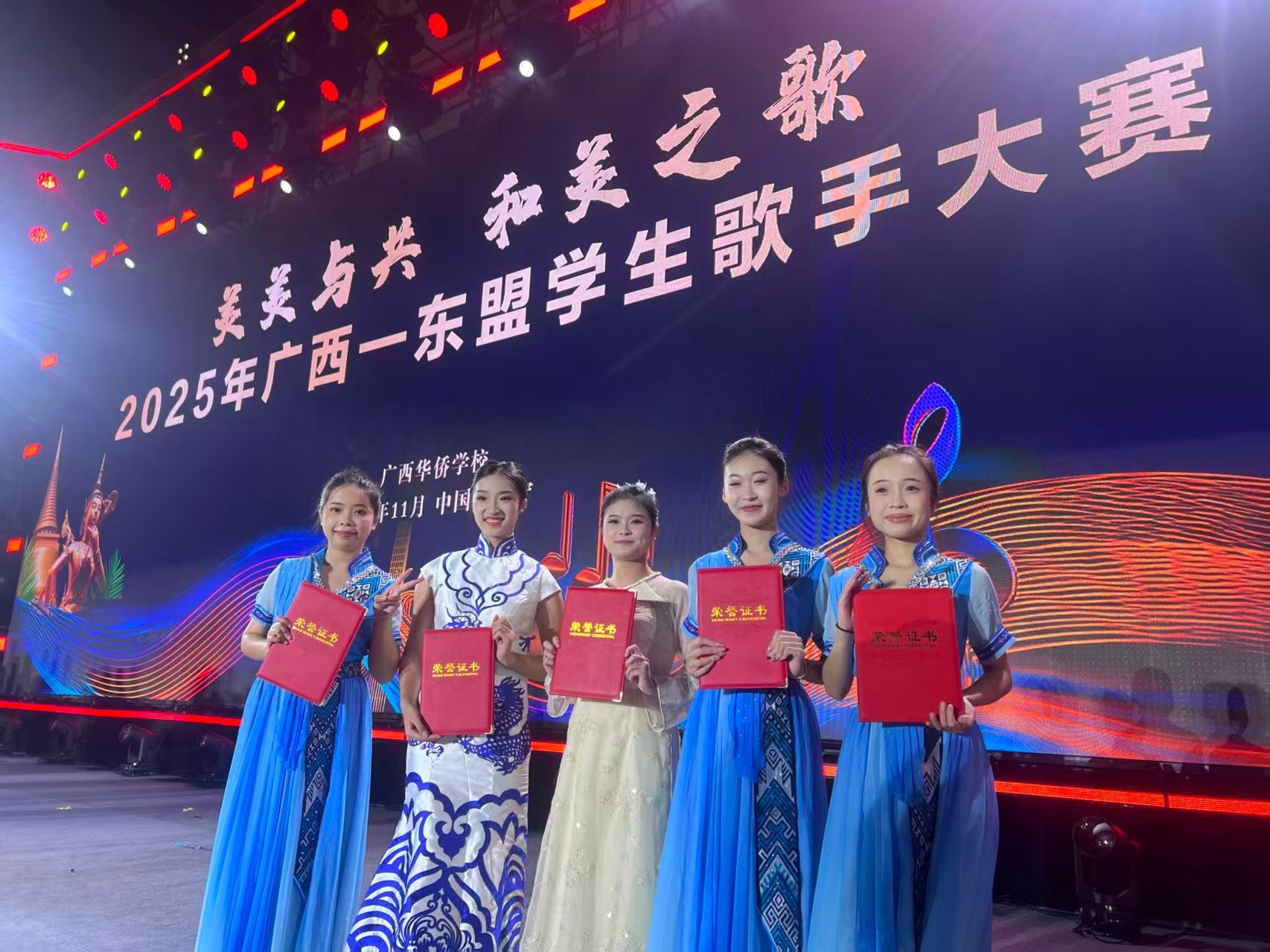 11月6日晚,2025年广西—东盟学生歌手大赛决赛在广西华侨学校圆满落幕。经过多轮遴选,我校《如愿》《胜利时再闻花开》两个作品成功入围决赛并斩获佳绩,为学校赢得了荣誉。